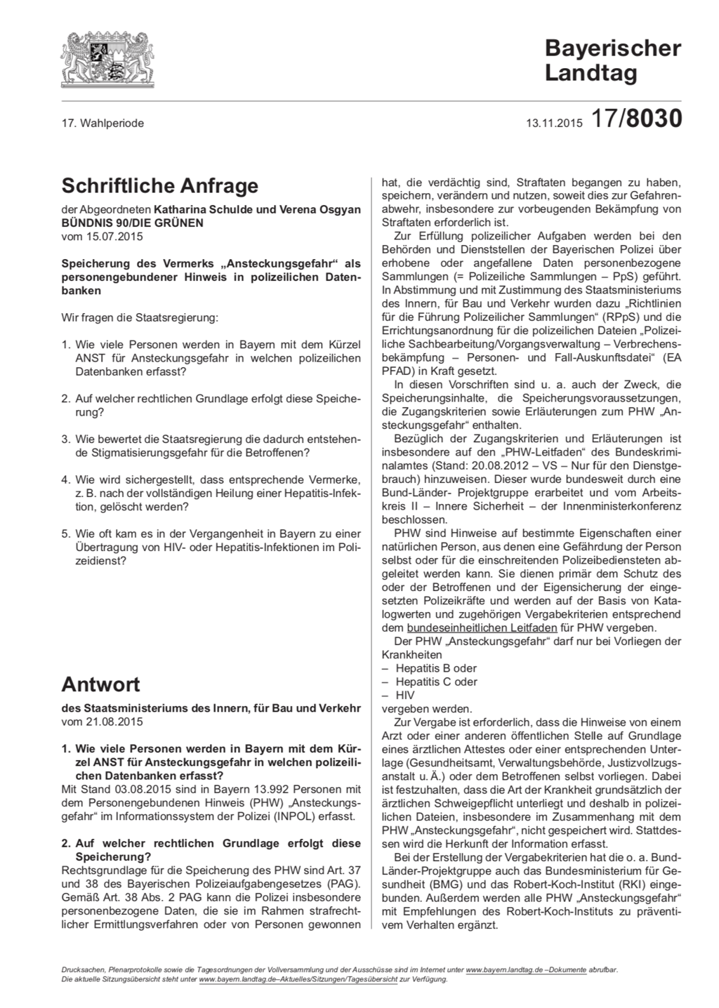 Zum Abschluss der Veranstaltung stellten die Münchner Positiven ihren Entwurf für eine Petition zur Abschaffung des Eintrages ANST in der Datenbank INPOL vor. Diese wird im Bayerischen Landtag eingereicht werden. Zusätzlich wurde eine Unterschriftenaktion gestartet.