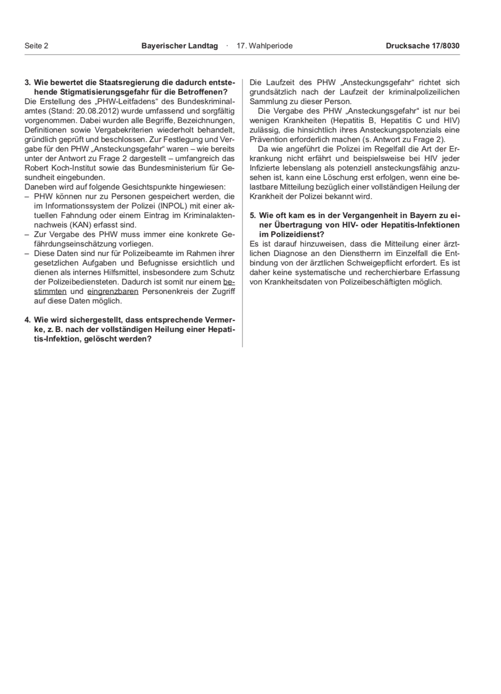 Kriminaldirektor Stefan Kastner vertrat die Auffassung, dass Polizeibeamte in Gewaltsituationen durch das Wissen aus der Datenbank besser geschützt seien. Angesichts steigender Übergriffe auf Polizisten und damit einhergehenden Verletzungen herrsche bei vielen Beamten die Angst, sich mit HIV oder Hepatitis infizieren zu können.